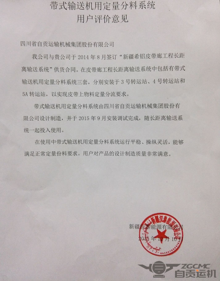 2015年自贡运机新产品开发项目“带式输送机定量分料系统”投入运行