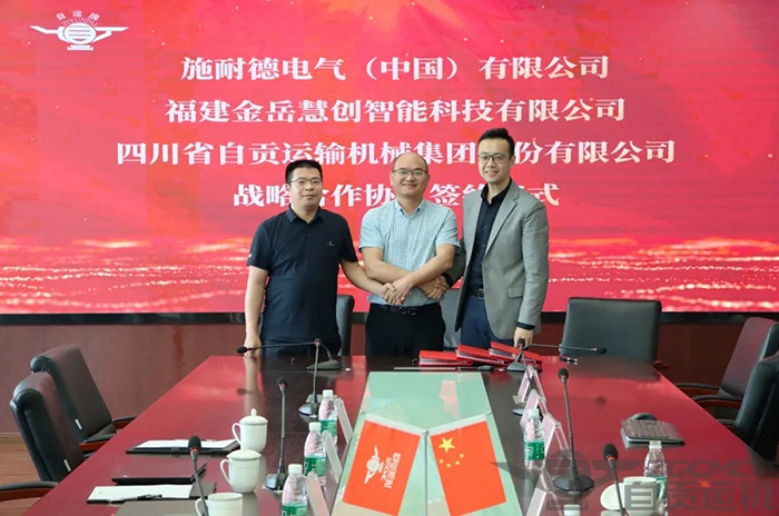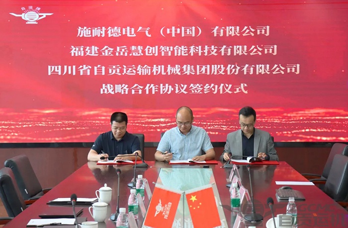 施耐德电气(中国)工业事业部副总裁乔锃和福建金岳慧创智能科技有限公司副总经理张家海,与尊龙凯时机械集团股份有限公司总经理吴正华签订三方战略合作协议。