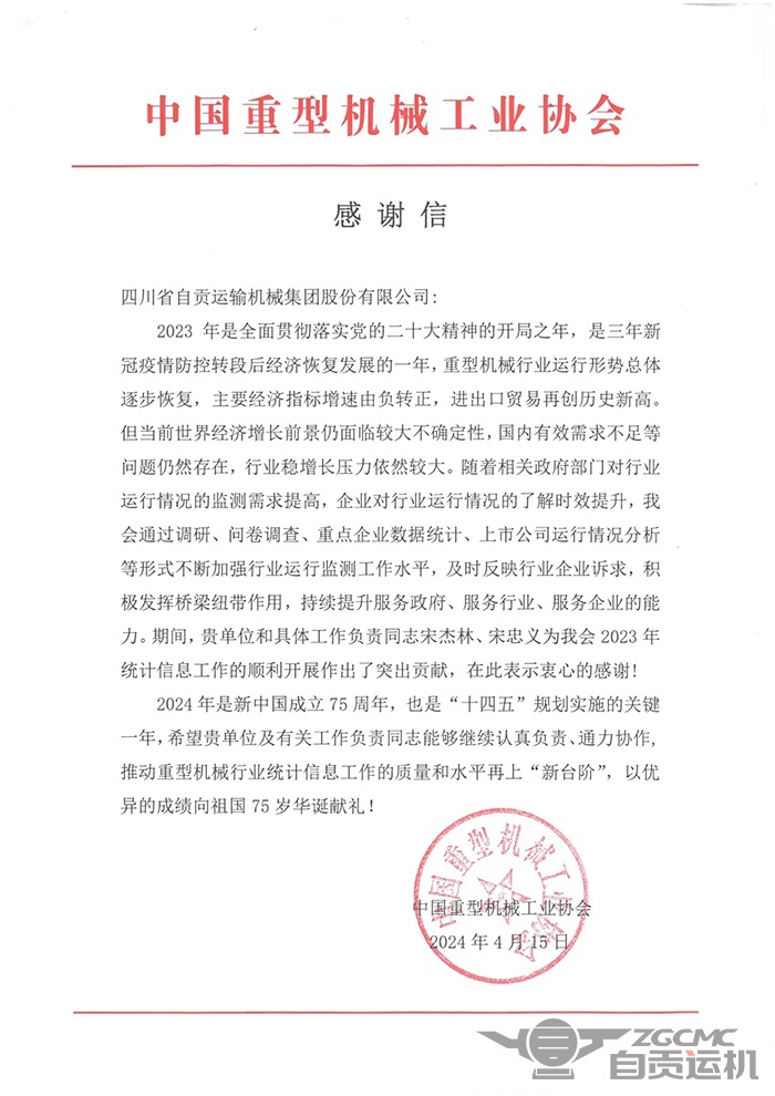 中国重型机械工业协会对尊龙凯时机械集团股份有限公司过去一年的贡献与工作表示衷心的感谢,并充分肯定了公司具体负责统计的宋杰林、宋忠义同志为2023年重型机械行业统计信息工作的顺利开展作出的突出贡献。