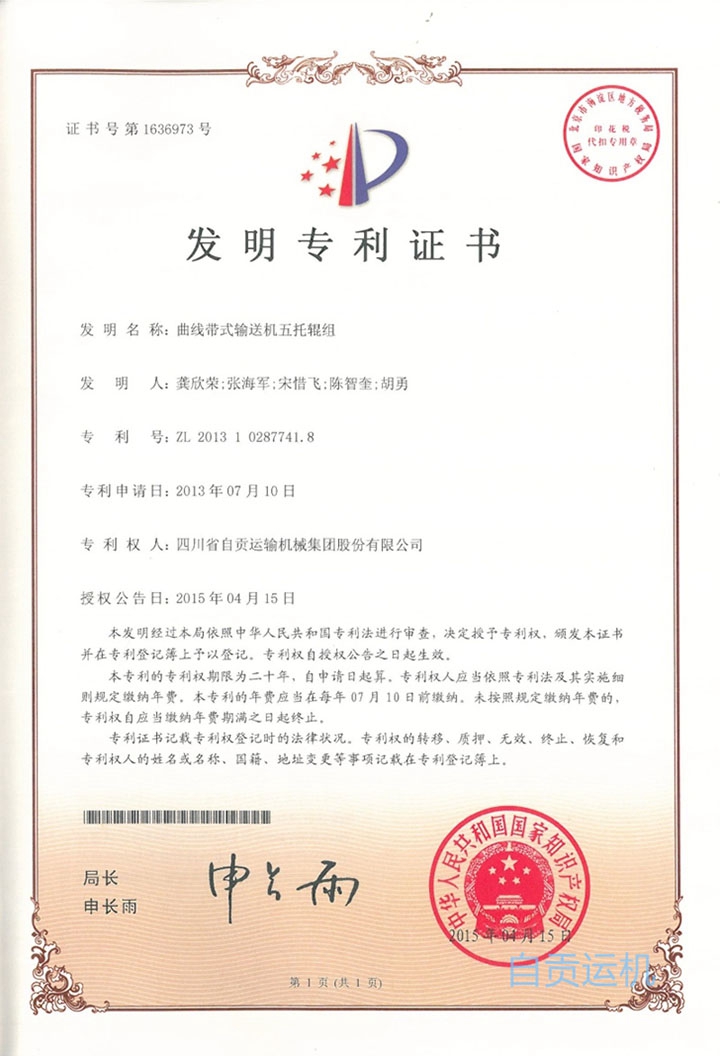 近日,自贡运机提出的发明专利“曲线带式输送机五托辊组”被国家知识产权局正式授权,标志着自贡运机在2015年知识产权保护方面迈出了坚实的一步。今年作为股份公司的创新年,自贡运机还将申请获得至少三十项专利,形成优势产品的知识产权保护墙。