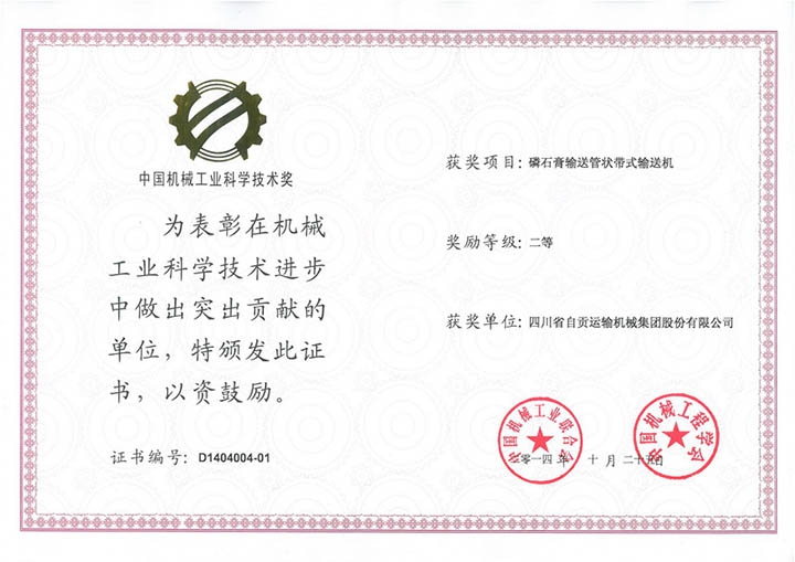 2014年10月,公司研制的磷石膏输送管状带式输送机荣获中国机械工业科学技术二等奖。磷石膏输送管状带式输送机是根据贵阳中化开磷化肥有限公司输送磷石膏的特殊要求,研制的长距离管状带式输送机,属四川省科技成果转化项目计划任务。项目产品经国家起重运输机械质量监督检验中心现场检测,各项技术指标符合有关标准,经用户使用,运行情况良好,满足了用户使用要求。2013年该项科技成果通过了四川省科技厅组织的专家鉴定。专家认为该项目的研制和应用是成功的,技术上有重大创新,符合国家节能环保政策,项目的整体技术指标达到国际 水平。