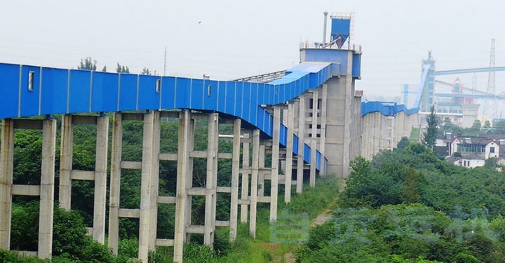 该管状带式输送机系统由两条组成,起点为鹤林水泥有限公司水泥仓,途经中部石灰石料场,跨越G312高速公路和京沪高铁后, 终达到长江码头。1#管带机长度2500m,管径400mm,带宽1600mm,驱动功率3X630kw;2#管带机长度1300m,管径400mm,带宽1600mm,驱动功率2X630kw。上承载带面输送水泥、水泥熟料和石灰石, 大输送量2000t/h,下承载带面输送量500t/h。为解决水泥输送扬尘和上下料不能混合等问题,我公司采用离散元分析技术设计了全封闭无动力除尘导料槽,研制了多工位输送带清洗、烘干设备并获得多项国家专利。水泥双向输送管状带式输送机的研制成功,标志着我公司在解决特殊物料输送关键技术方面取得了重大突破。