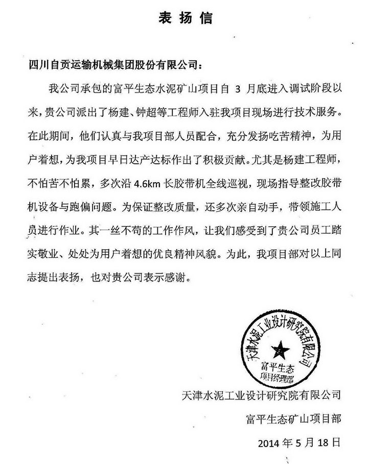在产品安装调试过程中,由于我公司现场技术服务人员专业、热情的服务精神和服务质量,得到了天津水泥工业设计研究院的高度赞扬。