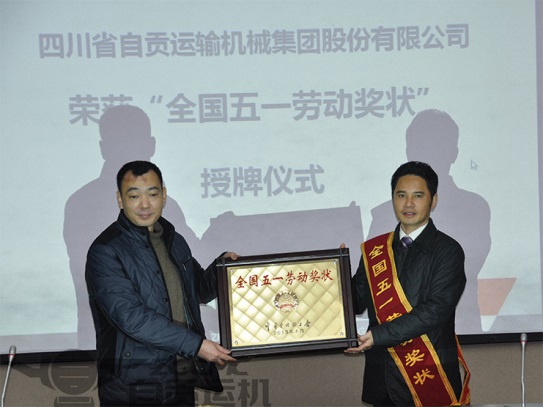 2014年1月27日,自贡总工会向我公司荣获“全国五一劳动奖状”进行授牌。