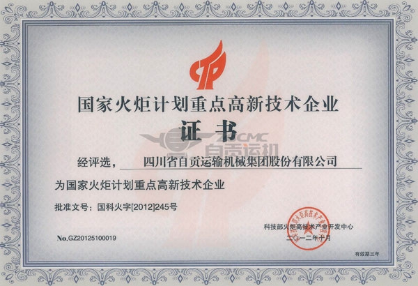 近年来,公司根据市场需要,在引进国外 技术基础上,消化吸收,不断开展技术创新活动,使公司在长距离管状带式输送机、曲线带式输送机、大运量带式输送机等技术方面取得了重大突破,形成了公司的自主知识产权,取得了良好的经济效益。按重点高新技术企业管理办法的规定,公司于2012年申报了国家重点高新技术企业,经科技部火炬中心组织评选,公司被认定为国家火炬计划重点高新技术企业。
