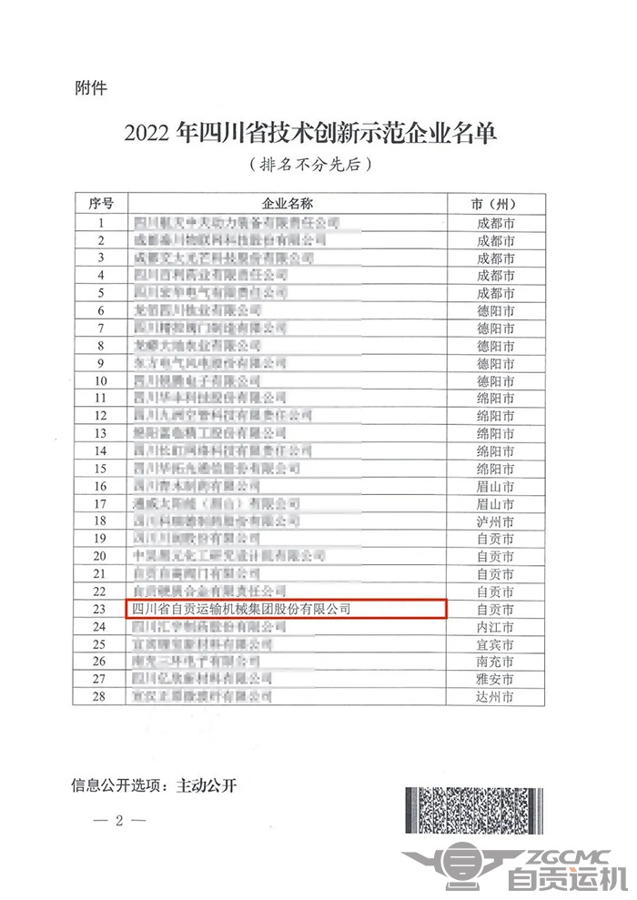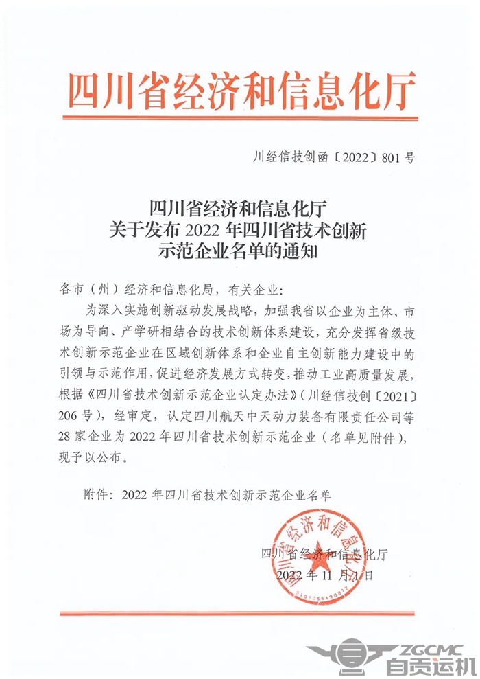 2022年11月3日,四川省经济和信息化厅《关于发布2022年四川省技术创新示范企业名单的通知》中,认定28家企业为2022年四川省技术创新示范企业,尊龙凯时机械集团股份有限公司位列其中。