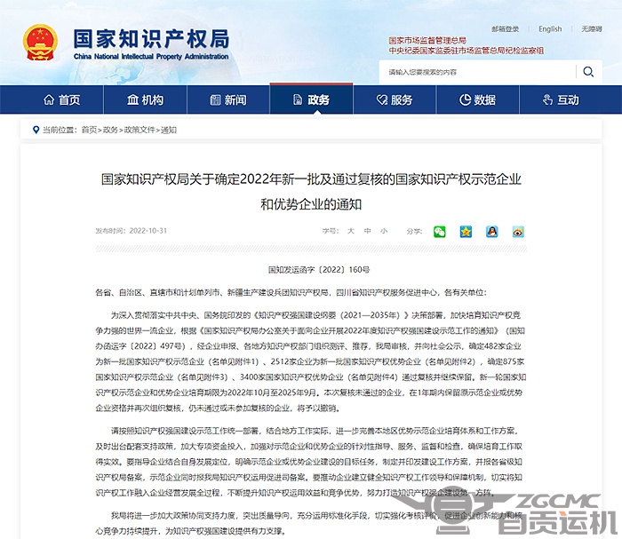 近日,国家知识产权局正式公布2022年度“国家知识产权示范企业和优势企业”评定结果。运机集团通过严格的复核审查,顺利通过国家知识产权优势企业复核。