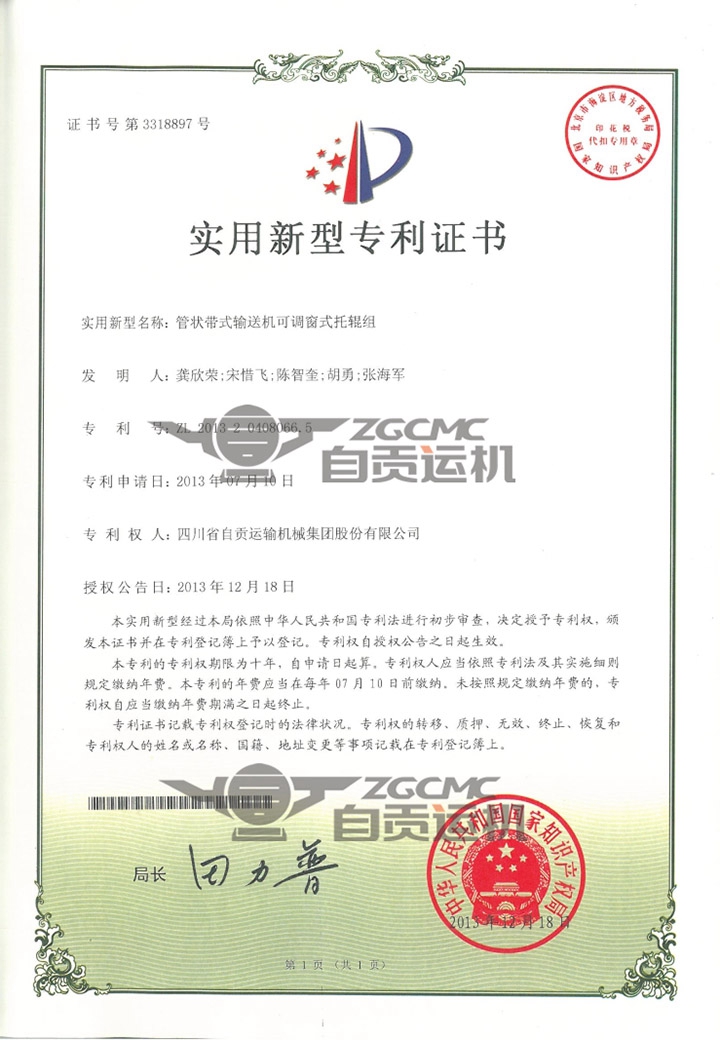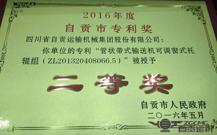 在2016年11月28日召开的自贡市科技创新  科技奖励表彰大会上,尊龙凯时机械集团股份有限公司的实用新型专利“管状带式输送机可调窗式托辊组”荣获自贡市专利奖二等奖,这是尊龙凯时机械集团股份有限公司 荣获专利奖。