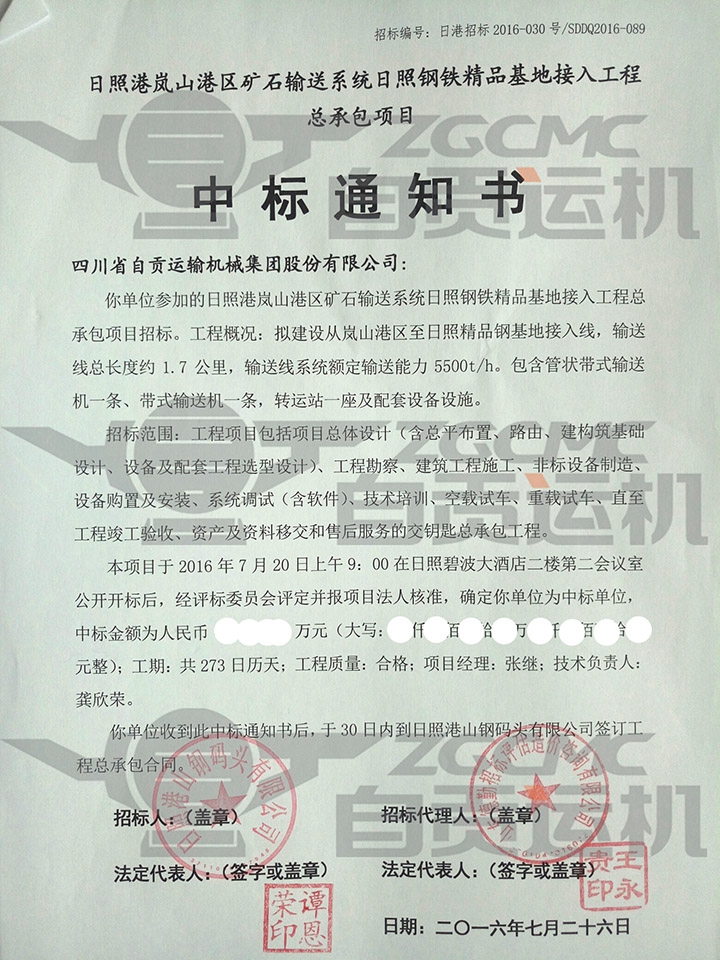 8月9日,接到日照港山钢码头有限公司“中标通知书”,宣布我公司中标“日照港岚山港区矿石输送系统日照钢铁精品基地接入总承包工程”项目。该项目是一条总长约1.7km矿石输送线,其中包含一条管带机、一条皮带机、转运站一座及配套设备设施,全线输送能力5500t/h。该项目在公司领导的精心布置下,面对今年市场情况不乐观的形势, 终,凭借公司良好的信誉、行业经验、强大技术实力以及优秀的方案、完善的质量进度保证体系、合理的报价赢得了招标单位的肯定,顺利中标。