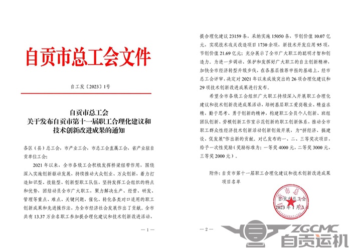 近日,自贡市总工会发布自贡市第十一届职工合理化建议和技术创新改进成果的通知。