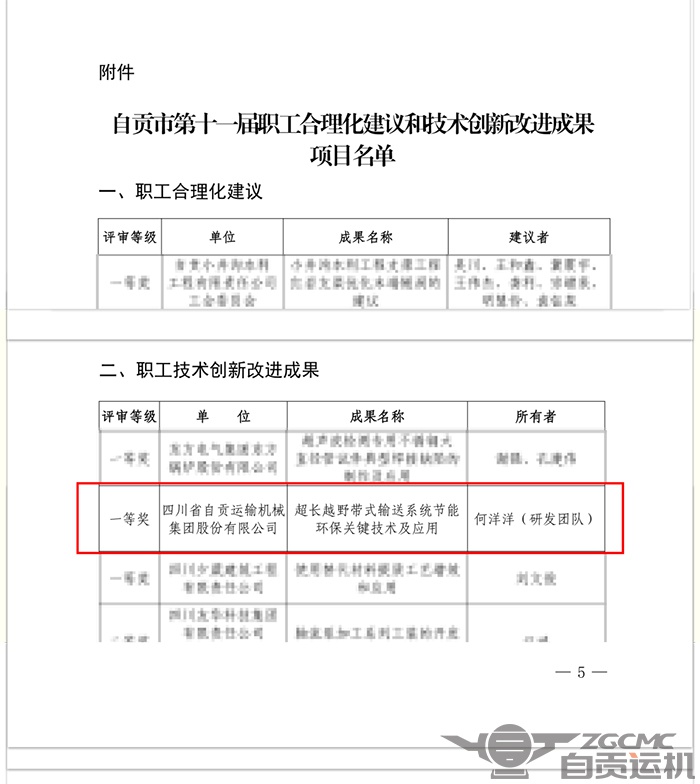 尊龙凯时机械集团股份有限公司——何洋洋(研发团队)的“超长越野带式输送系统节能环保关键技术及应用”荣获《职工技术创新改进成果》一等奖。